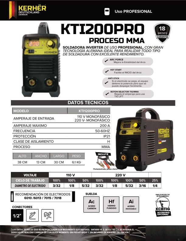 SOLDADORA INVERSORA KERHER PRO KTI200PRO. SOLDADORA INVERTER IGBT PARA PROCESO SMAW/MMA Y GTAW/TIG DE USO INDUSTRIAL, CON GRAN TECNOLOGÍA ALEMANA IDEAL PARA REALIZAR TODO TIPO DE SOLDADURA CON EXCELENTE RENDIMIENTO. QUEMA TODO TIPO DE ELECTRODOS HASTA 3/16″